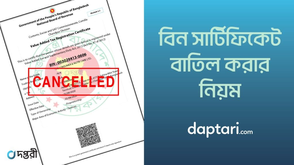 30 Jul Blog ভ্যাট সার্টিফিকেট বাতিল করার নিয়ম Posted by Daptari Consultancy July 30, 2022 ৬. ভ্যাট নিবন্ধন বা তালিকাভুক্তি বাতিল ৬.১ মূল্য সংযোজন কর নিবন্ধন বাতিলকরণ যেসকল কারণে নিবন্ধন বাতিল হবে: নি উল্লিখিত কারণে নিবন্ধন বা... Continue reading